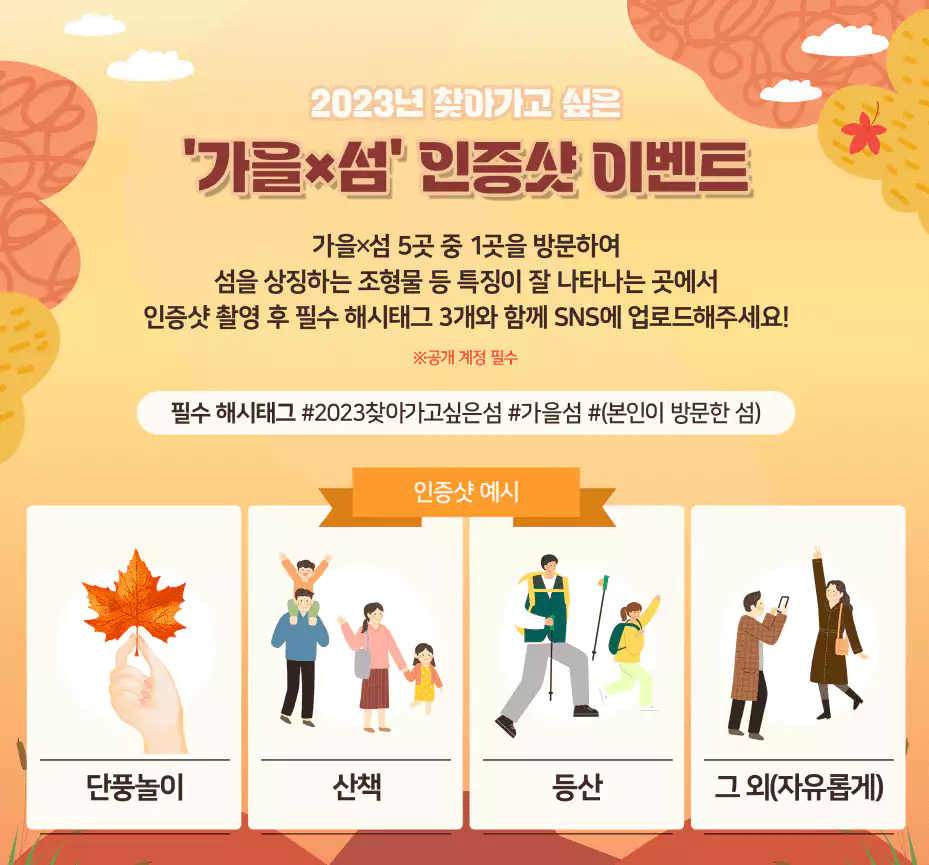 2023년 찾아가고 싶은 가을섬 인증샷 이벤트에 대해 알아보았는데요. 가족과 함께 또는 친구와 연인과 함께 이번 가을 아름다운 섬에서의 즐겁고 행복한 추억 만들어보시는 건 어떨까요?